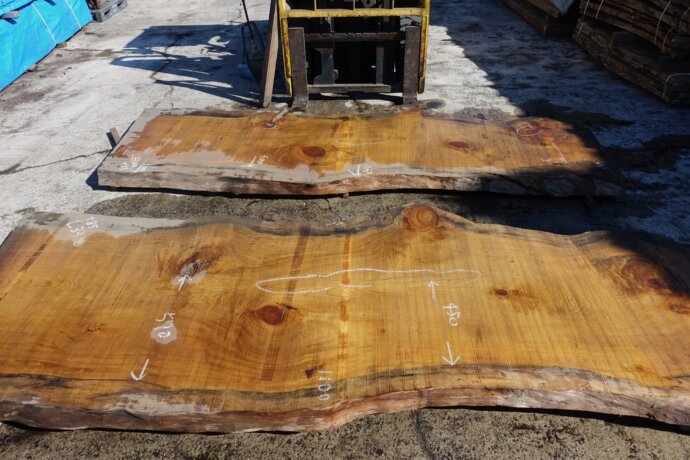 ■ MUKU-DATA 欅(ケヤキ)一枚板 2400 980-890-1020 t42mm 天然乾燥材 未加工 なんとかくこのケヤキ、目も細かく素性が良さそうだと仕入れた板好きな樹種を3つ選んでくださいと言われても、選…