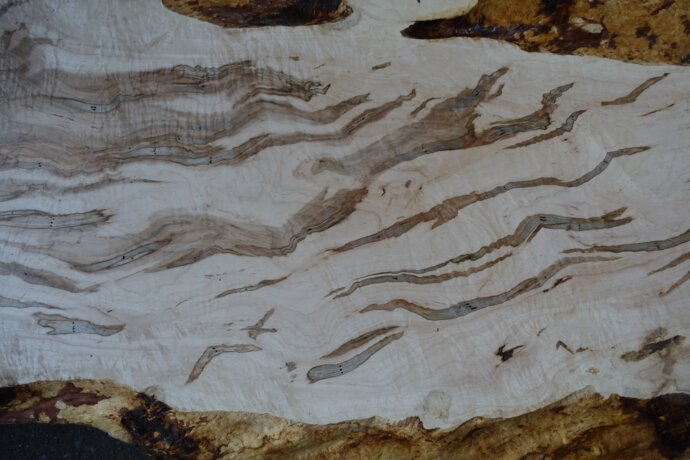 ■ MUKU-DATA アンブロシアメイプル 天然乾燥材 プレナー加工済み 杢+虫の這った痕のメイプルこの木、生材の時に樹皮を剥がすのに手間がかかり小さな2枚は途中で、皮むきを断念してしまったのだが案の定、樹皮部分には虫…