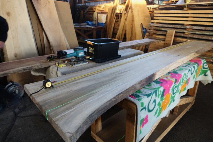 ■ MUKU-DATA 左:ユリノキ 右:パオロサ 昨日Nが倉庫に来てカウンターの木取りをはじめた。ユリノキはキッチンカウンターとして、色のあるパオロサはワークスペース?のデスク?棚板? いづれも片耳を残した使い方をす…