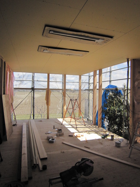 外部木製建具枠取付中。ここU様邸は平屋で長い廊下、この廊下に特注の木製建具が取り付きます。