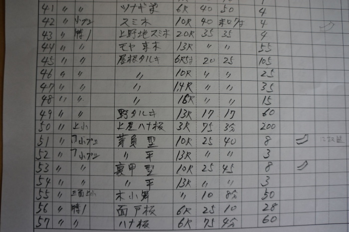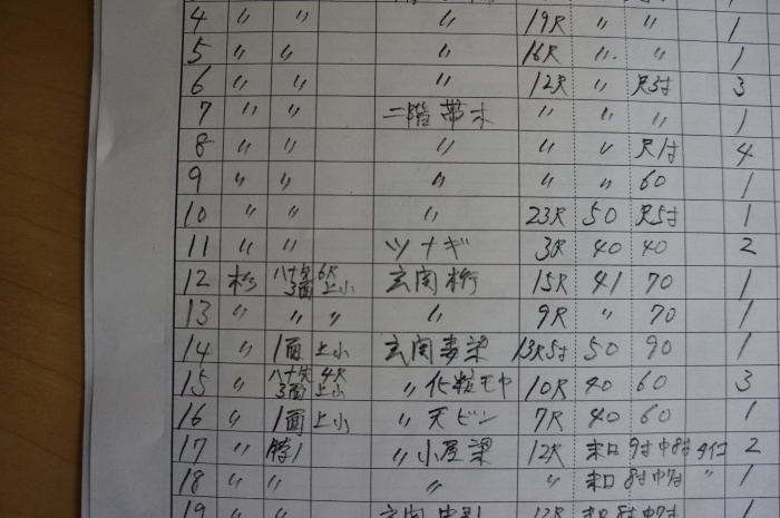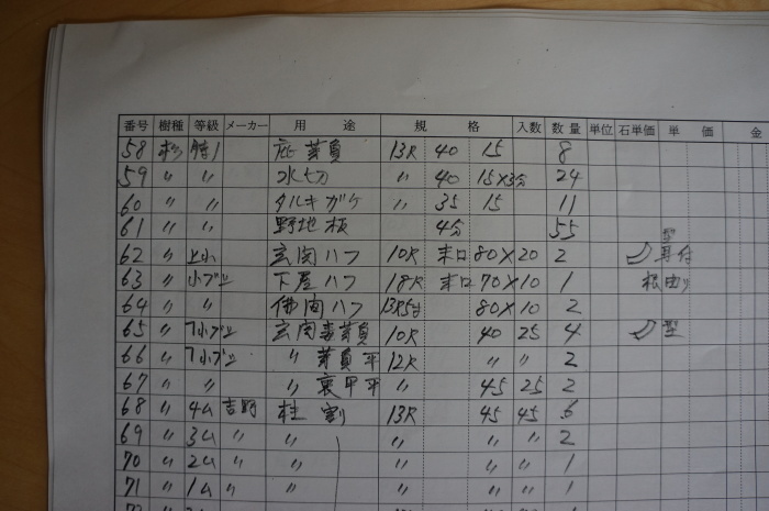 「見積りしてくれ」ってこのように大工さんが一本一本細かく拾い出した木材調書をいただいたものです。