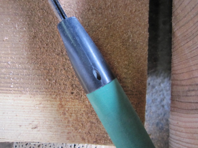 この鋸、切るときに柄(え)の部分から空気をだして墨を見やすくする為に