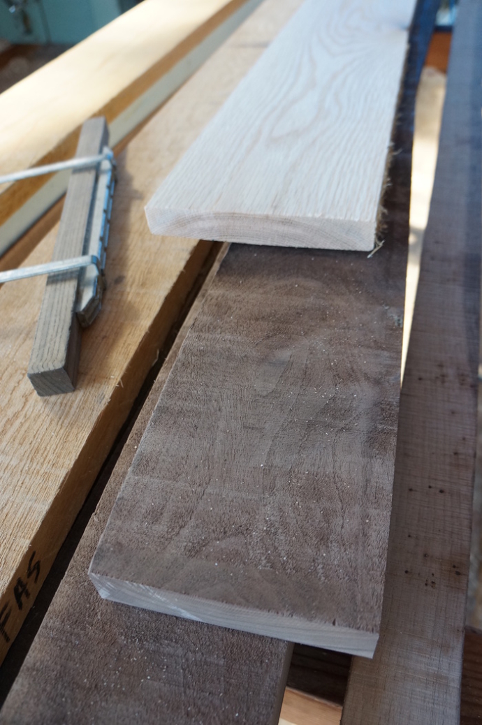 ■ MUKU-DATA 左:ホワイトオーク 右:ウォルナット 厚み 5/4(32mm) ナット一部8/4(51mm) 愚痴ってましたね・・・大工さんが・・・反ってるし、硬いしって言って・・・(苦笑) でも「へぇ~っ…