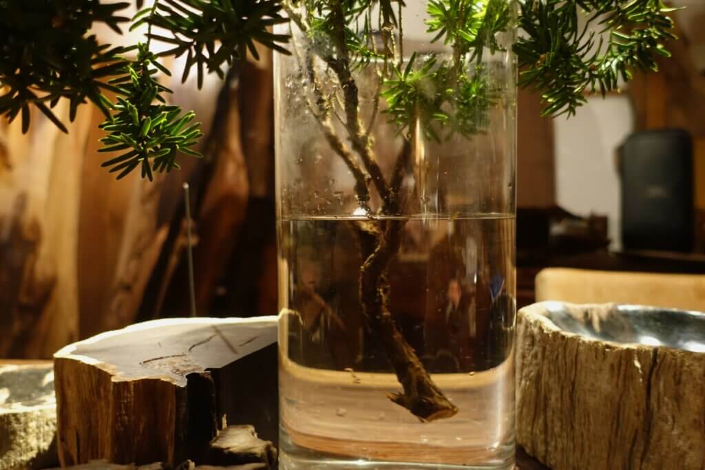 夜は花瓶に伐ったイチイの枝を指して一杯やりながら眺めていた。