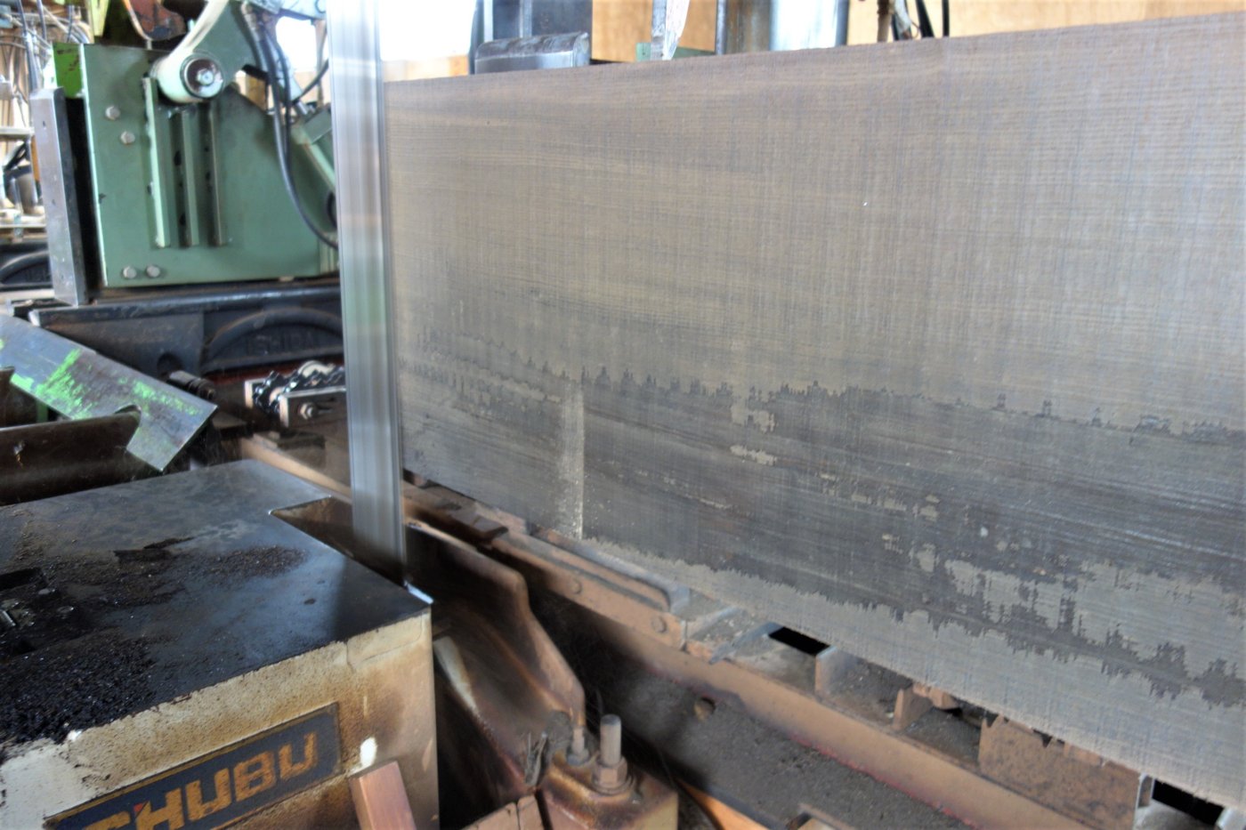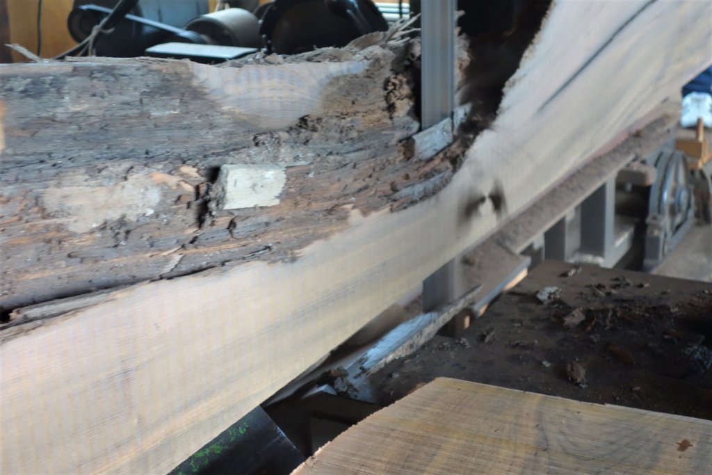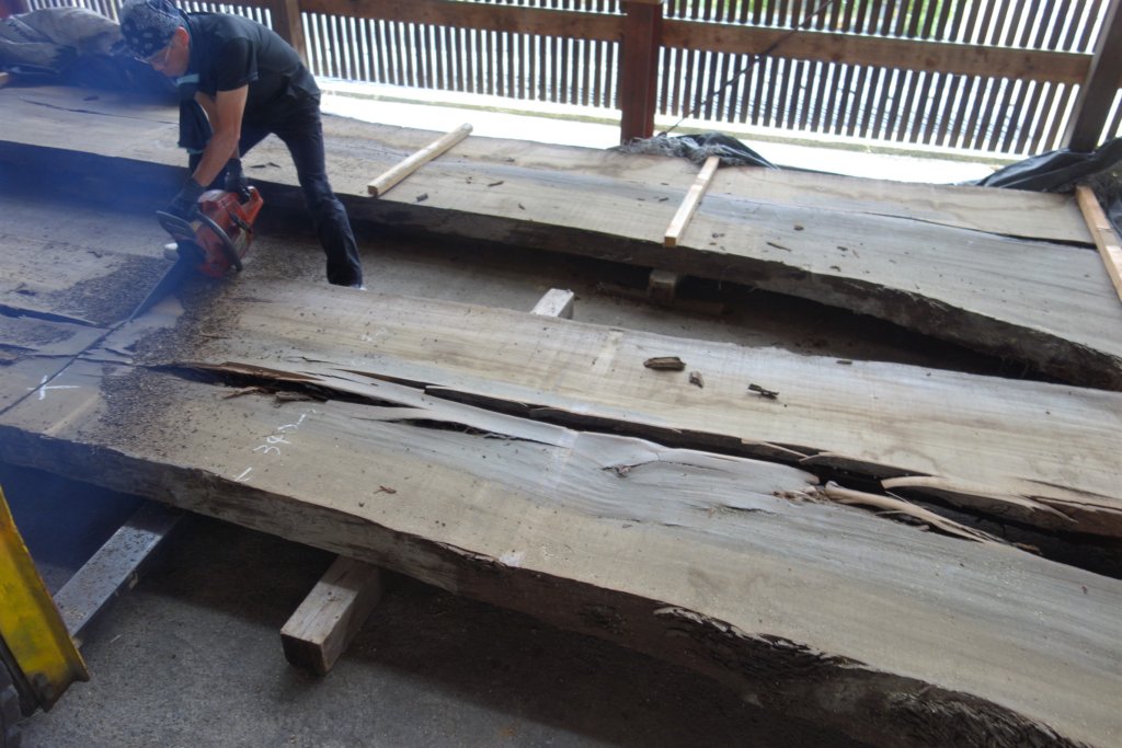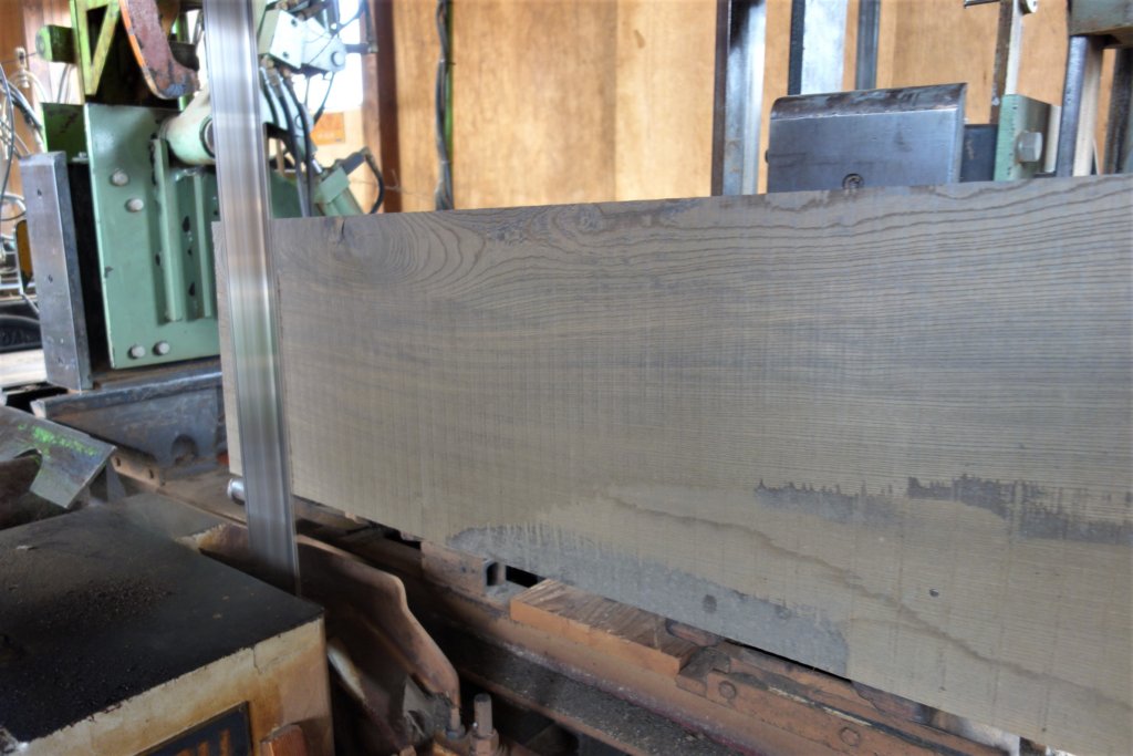 この現場とは関係ないが、茶神代欅の角材で傷んでいる盤を柾挽きする。
