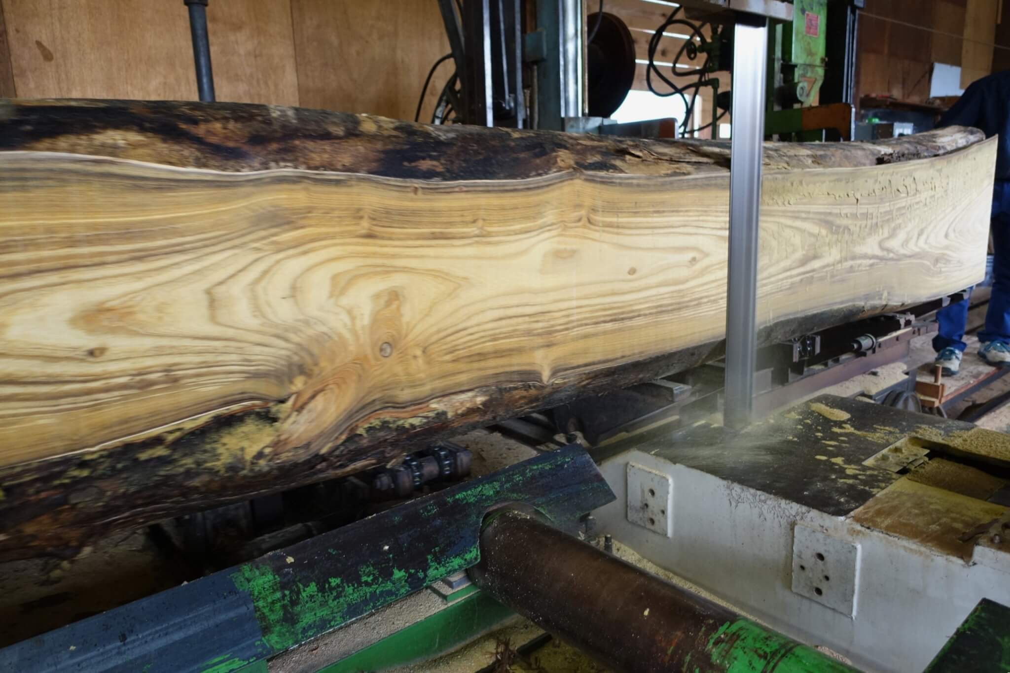 帯鋸の製材する音、特に鋸を変えたばかりの切れ味のいい音、