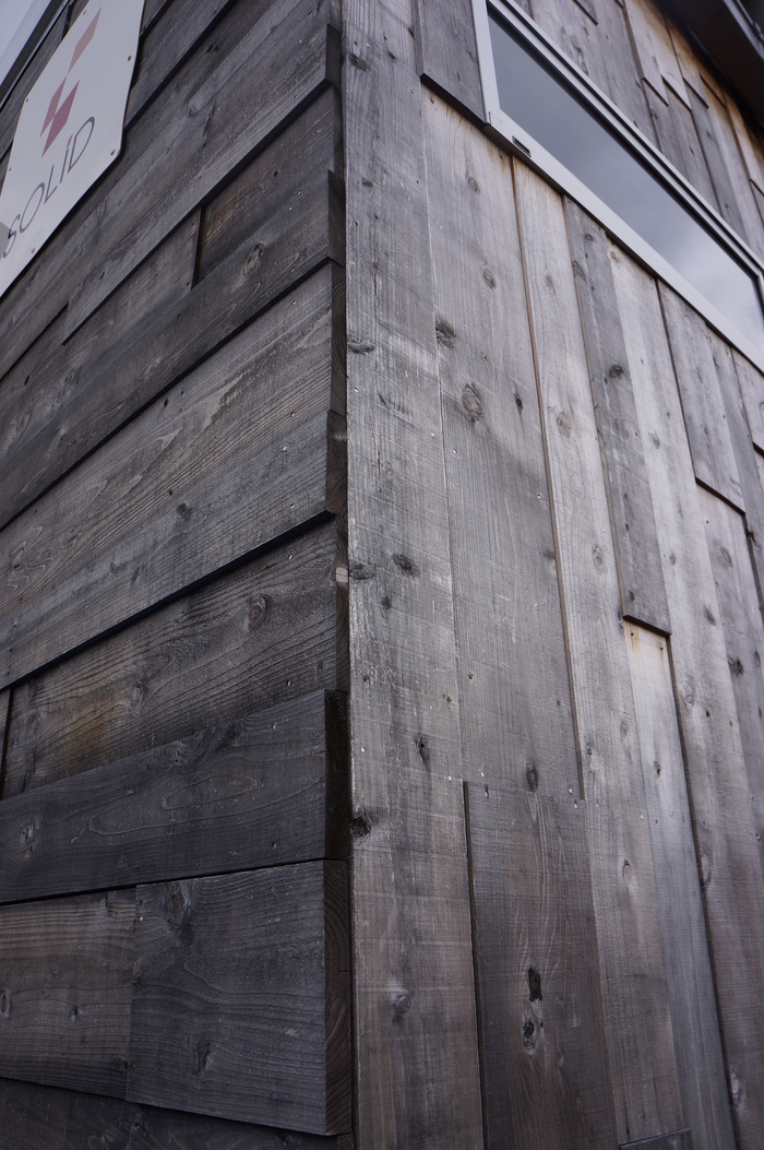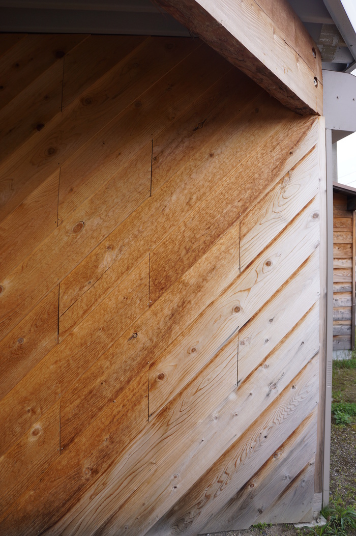 会社の外壁にはいろいろな張り方で板を張り、その経過を観察しています。