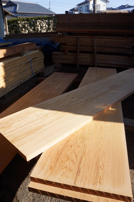 大きな盤ですので完全に乾いていませんが、45mmで米杉ですので半年位である程度使えるようになるかと思います。