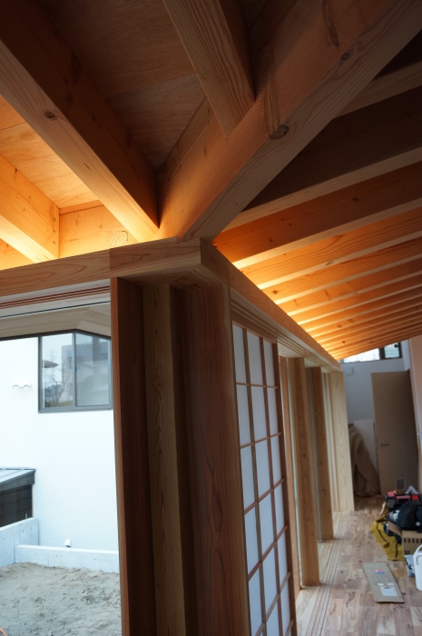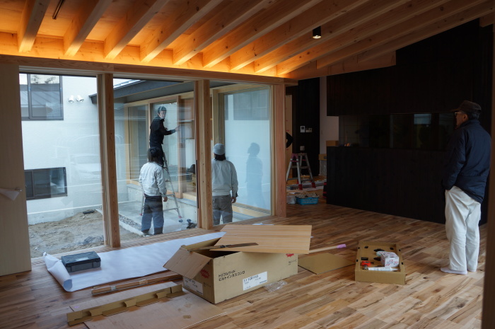 ここで毎日作業を行っていた大工さん(波多野さん、今津さん)と完成間近の平屋のコートハウスを見てきました。