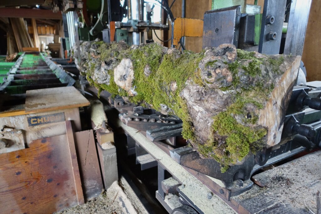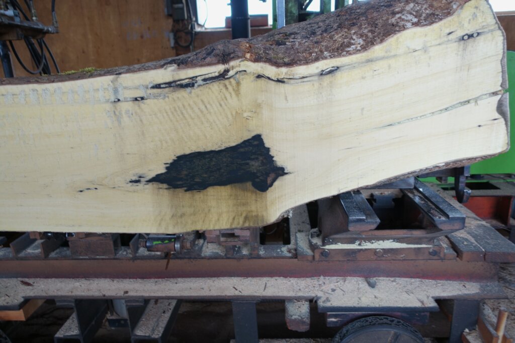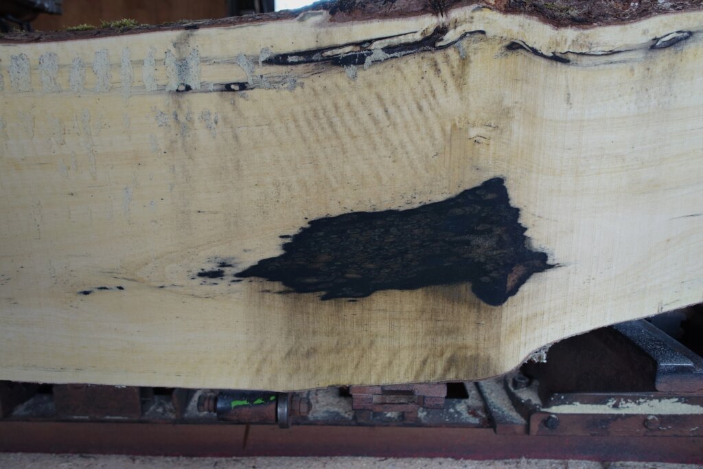 僅かに孔雀杢が出た丸太もあるが芯が腐っていて残念