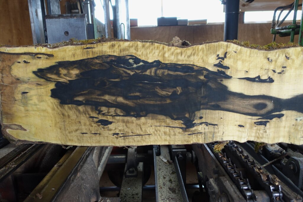 むしろ、瘤のある丸太はベタ黒に近いが、材面が瘤に沿って波を打ち