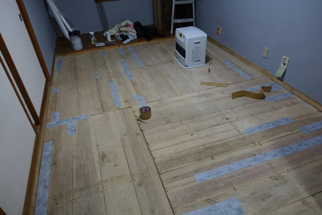 既存の床の上に仕上げでラーチ12mm合板を貼る。