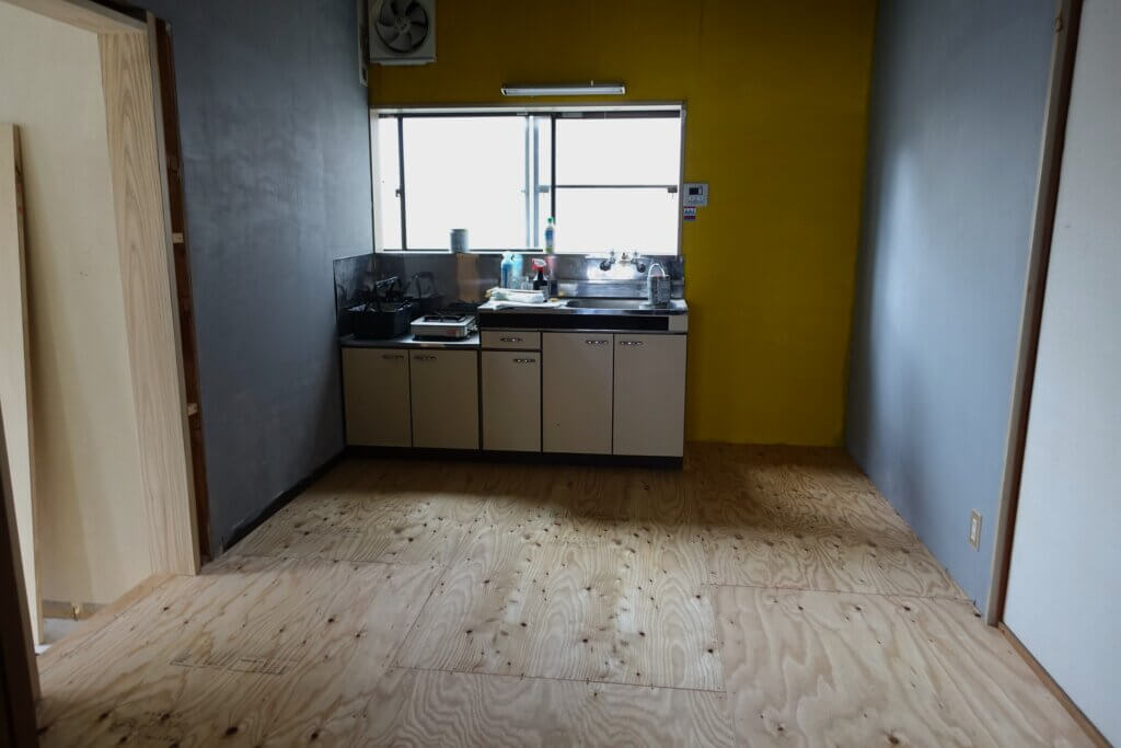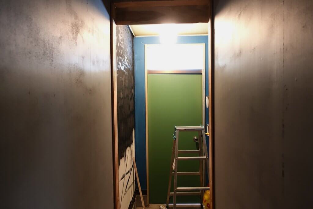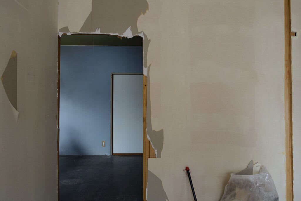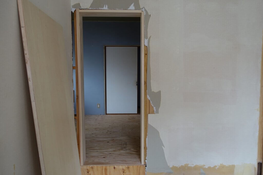 壁を突き破り開口した箇所にドアを付ける為に杉の枠材を回す。