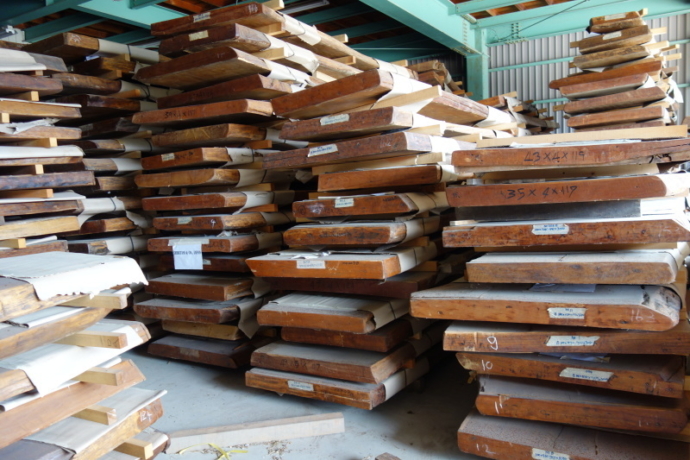 ■ MUKU-DATA ミャンマーチーク 巾広板 某所にて大量のミャンマーチークを見せてもらった。 (巾広でこの量は凄いなぁ・・) なかなかチーク材の巾広はお目にかかれない。 数年前に名古屋港に保管されたチークの丸太を…