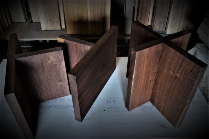■ MUKU-DATA ウォルナット 脚 オバンコール天板用の脚でこげ茶っぽい色合いのもので、 納期は10日ほど とかなり急な相談を受け、加工所に無理を言って何とか間に合わせたウォルナット板脚 ちょっとした工夫で、良く…