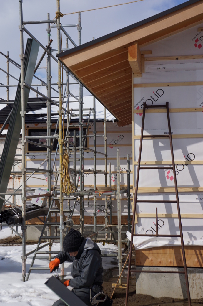 ■ MUKU-DATA 破風板:ウェスタンレッドシダー 柾目150mm、 桁・タルキ:米松 、 軒天井:杉 / 新潟市秋葉区 M 様邸 晴れ間が出たと思ったら急に雪が降り出したりと、、、 冬の新潟の現場は常にこんな感じ…