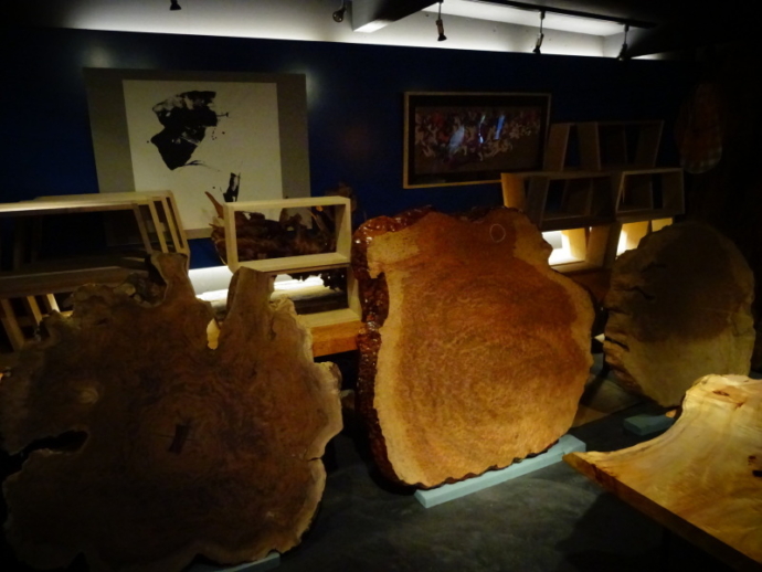 ■ MUKU-DATA  左からクラロウォルナット、樟瘤、材種不明 ブナ? 円形の一枚板、 昔、和室にあった輪切りの年輪がわかるブビンガ材などありました。 最近ですとモンキーポッドの輪切りも時々目にします。 今回は楕円の…