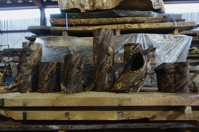 ■ MUKU-DATA 太角 天然乾燥材 手前左:鬼胡桃 3750 250×250mm 芯持ち背割れ手前右:栗 3700 250×125mm 芯去り奥 :黄檗 3800 330×330mm 芯持ち背割れ 時…