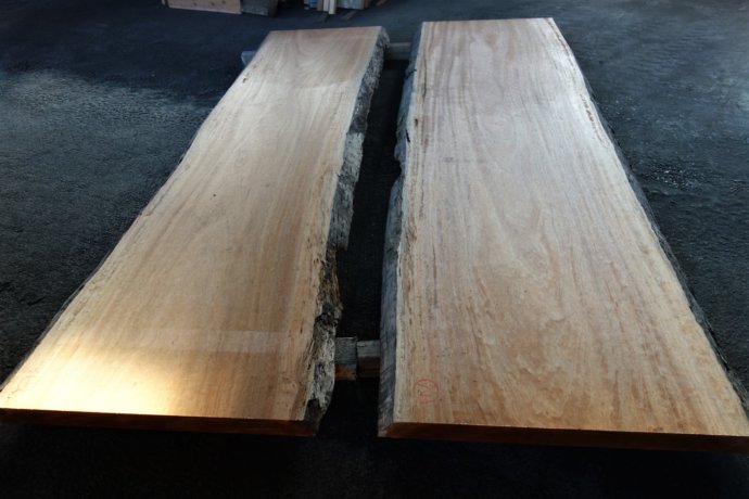 ■ MUKU-DATA 手前:パドック 奥:花梨(カリン) パドックは片耳付き、辺材白太と赤のコントラスト L3900×D450mm程度花梨は両耳落としのストレートカットジワジワした杢目が出てきます。4800×600…