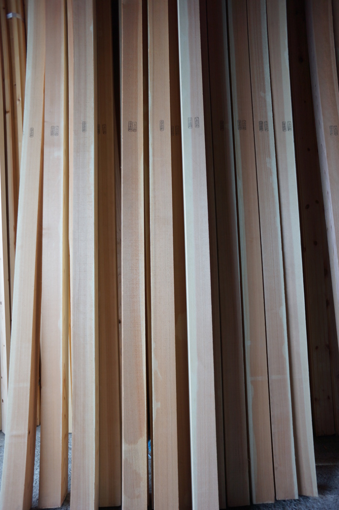 ■ MUKU-DATA 桧 KD 特一(並材)3000 105mm角 仕分け、番付け 1/15 節のある並材(特一等材)の仕分けほど難しいものはない。化粧柱、節があってもその中でもいいものを化粧部分へ回したいとの設計…