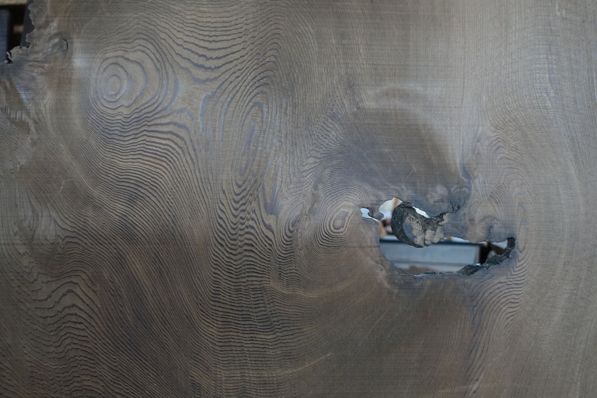 意図せずに無造作に漆の跡が板に付着して模様となっている。