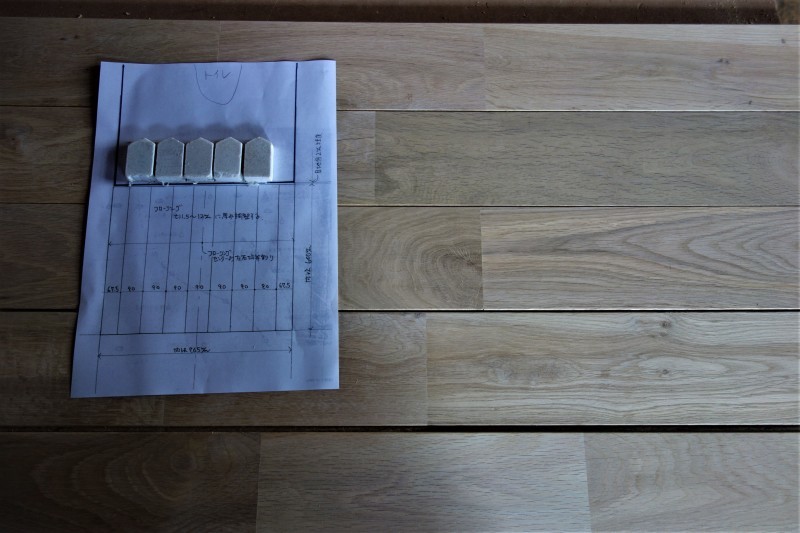 フローリングの割付の絵を書いて(5~10分ほどのラフ図)大工さん不在の作業所に置いてきた。