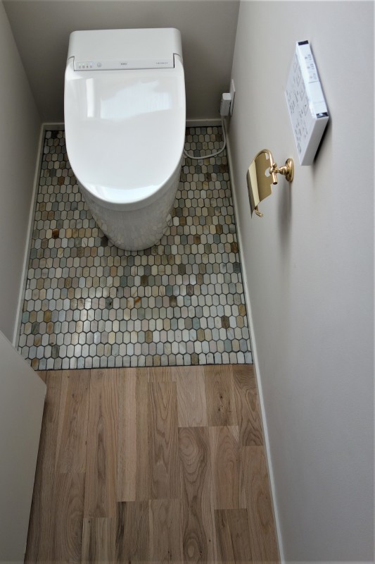 3/5ほどタイルを貼り、手前はナラのフローリング張り。