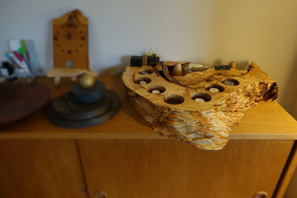 施主さんのアイディアでできあがった栃の時計ケースも何気なく置かれてあった。