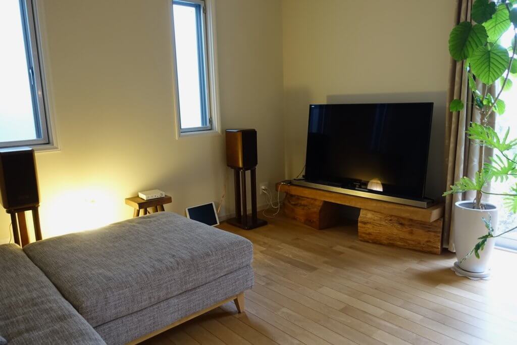 テレビボードの脚は丸太の輪切りが使われている。