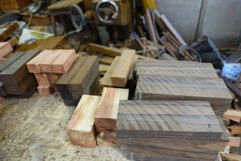 木取りして粗削りしてある程度の形を作り、作業がし易いように作られた治具や