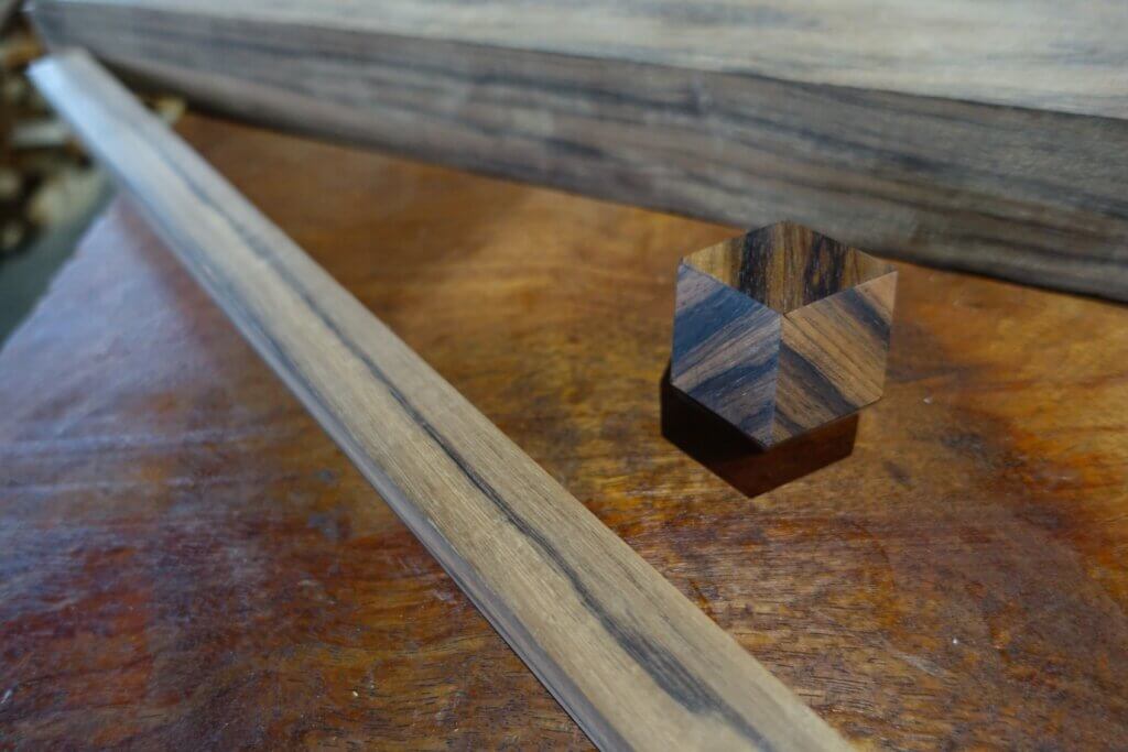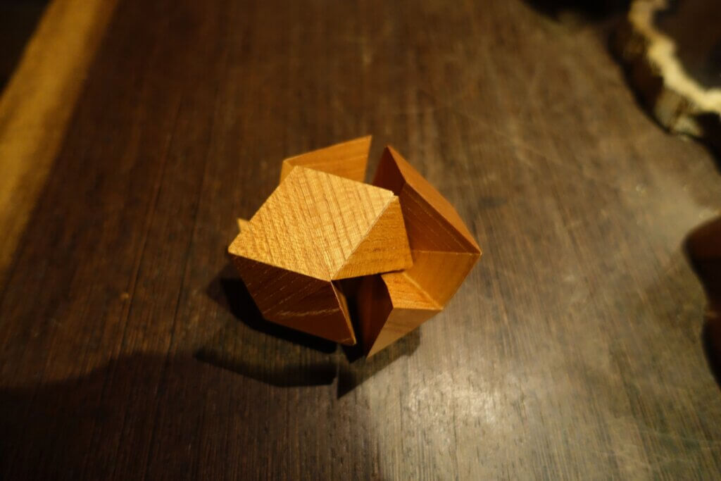 左の欅を組合せて作った12面体寄木組木は、はじめて手にした。