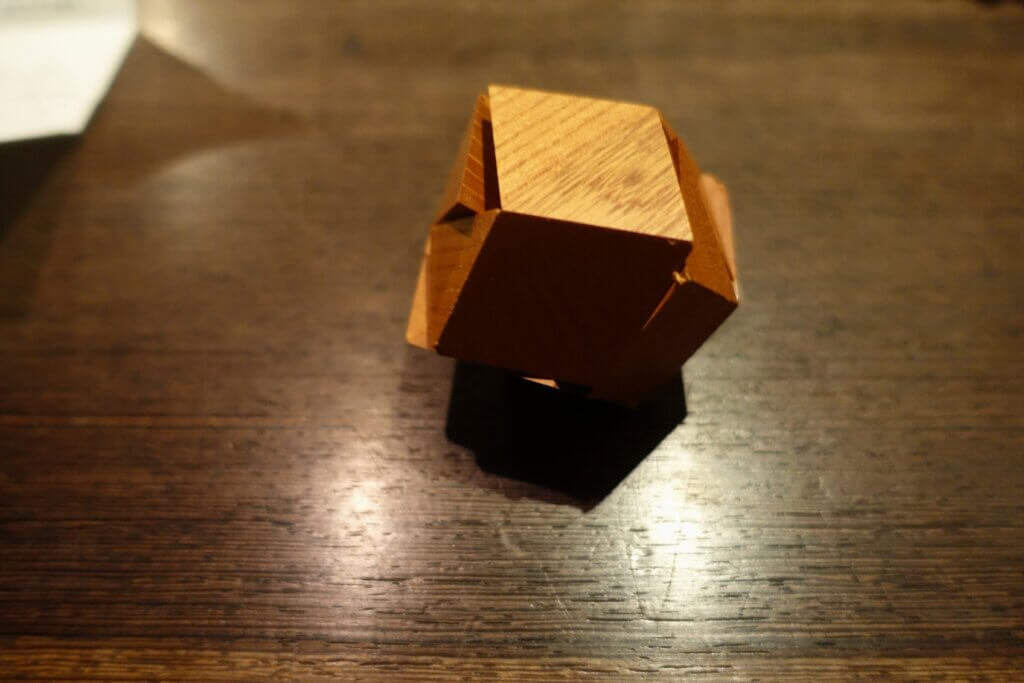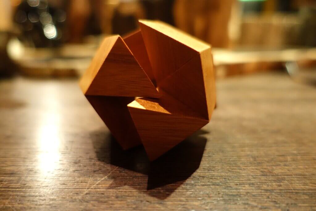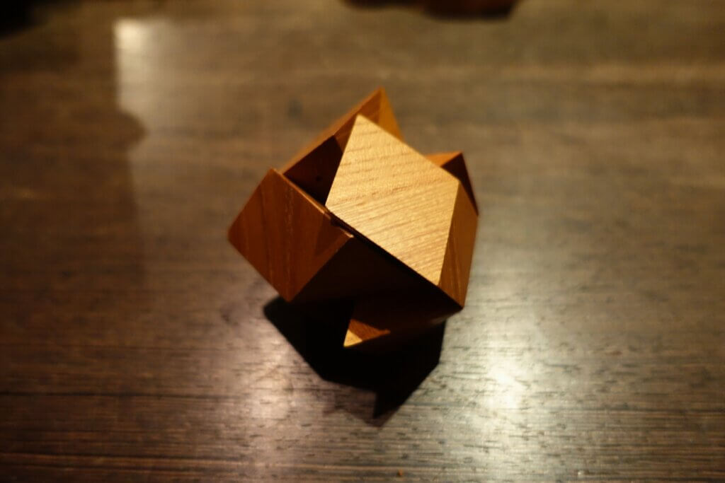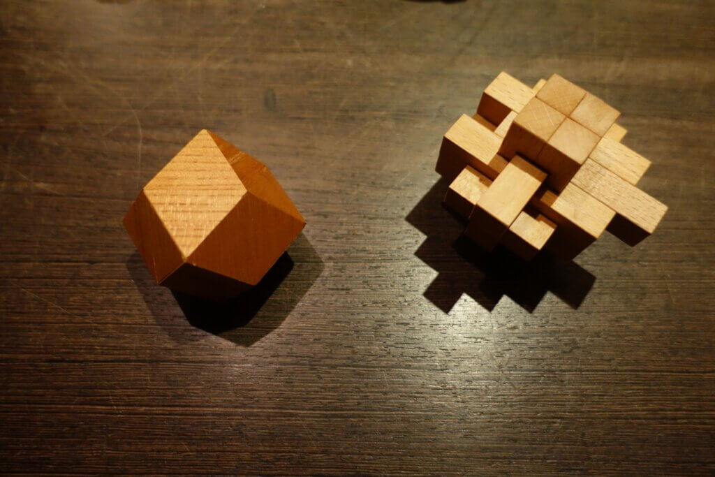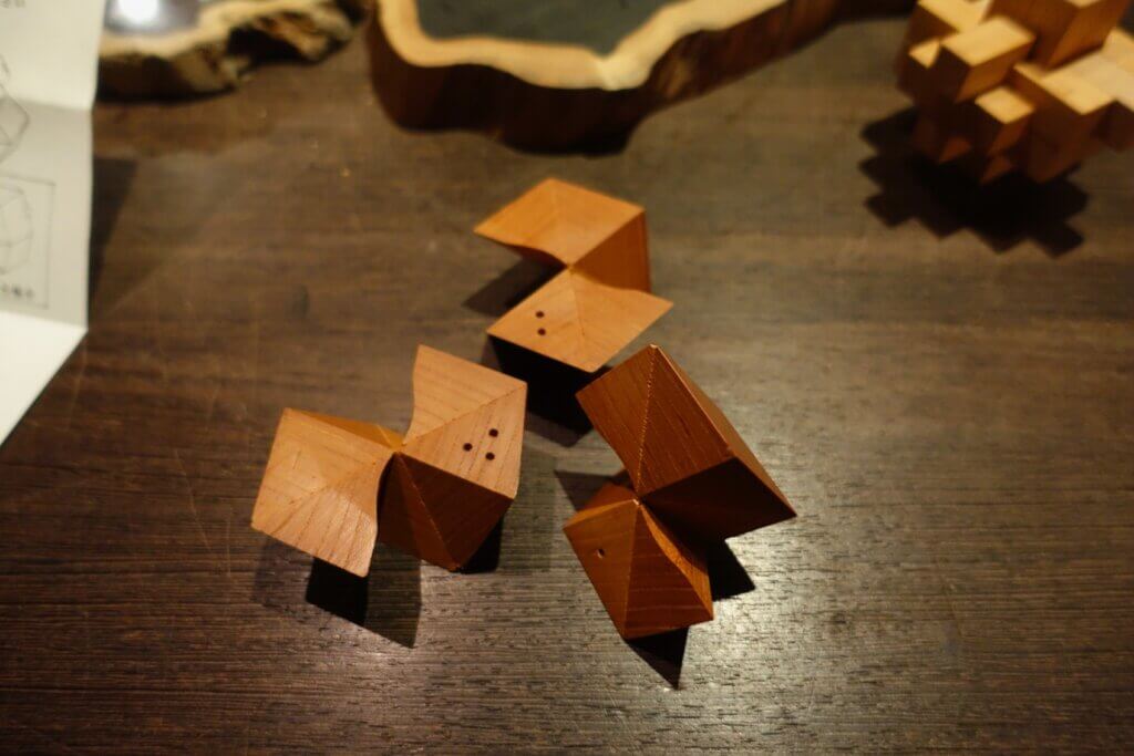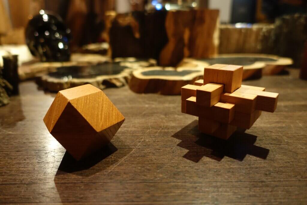 右の棒状の組み合わせた木製立体パズルのようなものは