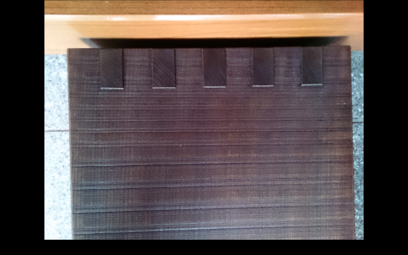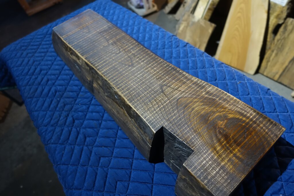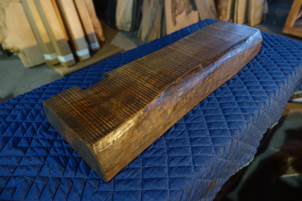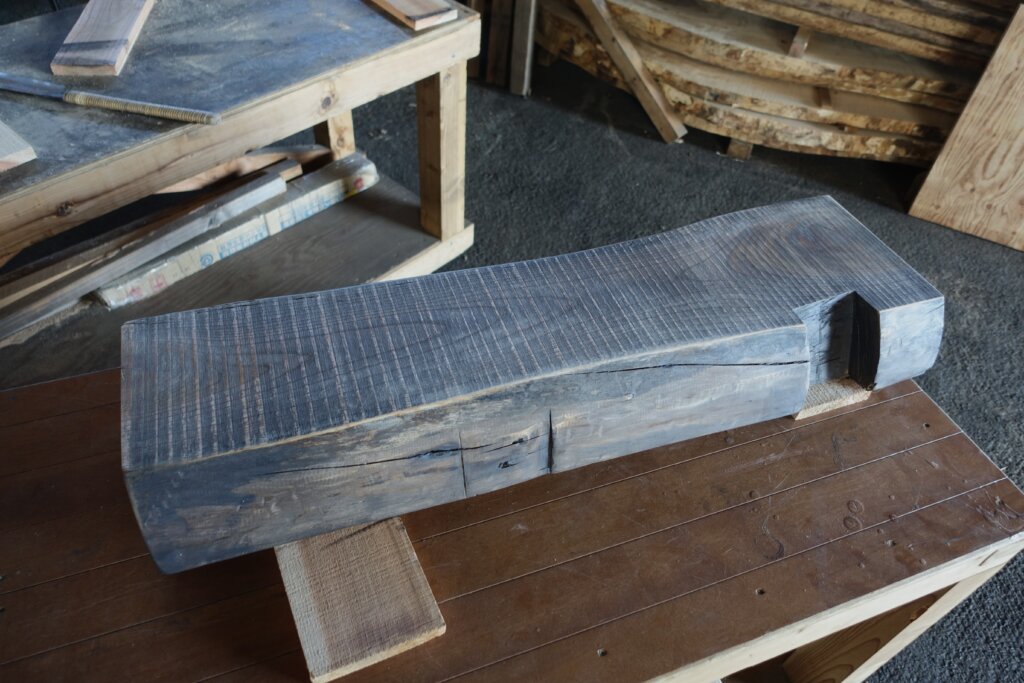 帯鋸で表面を擦り落とし、帯鋸目の痕をそのまま残すことにした。